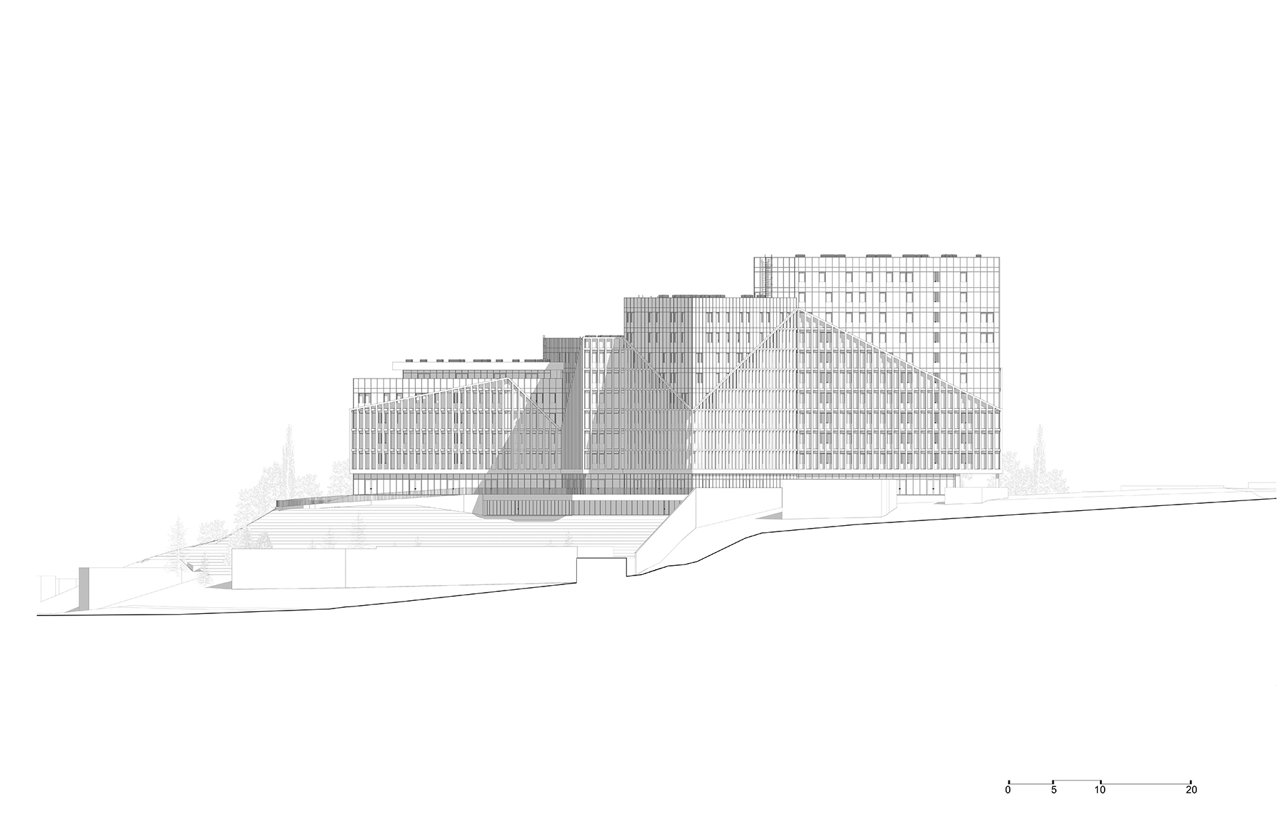 To meet the required area for the hotel and residential units, a plan with minimal width and building mass was identified. The clear rectangular plan was compressed onto the permissible terrain, resulting in a zigzagging, irregular shape that adapts to the site’s specifics, views, sun exposure, regulations, and circulation patterns. This shift in perspectives, along with the zigzag plan, also influenced the façades, where the jagged lines between the stone cladding and clear glass surfaces makes the building appear slimmer, while emphasizing its dominance without providing a clear orientation to the surroundings.